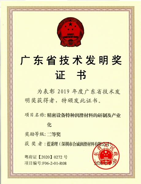深圳市合誠潤滑材料有限公司“精密設備特種潤滑材料的研制及產業化”項目榮獲廣東省人民政府批準頒發2019年度廣東省科學技術獎項——技術發明二等獎。