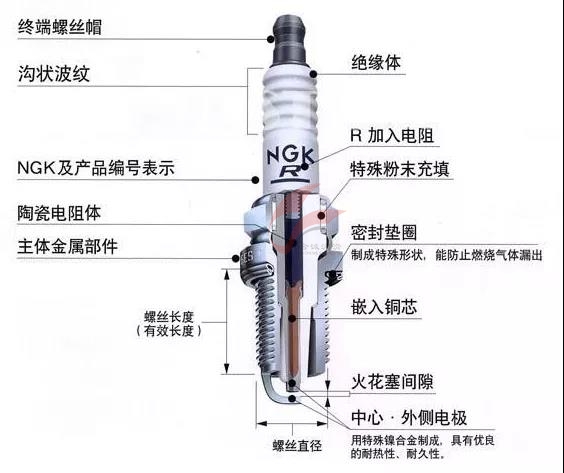 結構并不復雜,用途單一。汽油機點火系統中將高壓電流引入氣缸產生電火花,以點燃可燃混合氣體。火花塞由接線螺母(終端螺絲帽)、絕緣體、陶瓷電阻體、主體金屬部件、中心電極、側電極等部件組成,側電極焊接在外殼上。